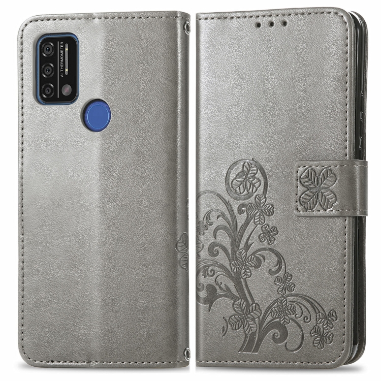 Funda de Cuero para Umidigi A9 con Cierre de Cuatro Hojas, Hebilla, Ranura para Tarjeta y Soporte (Gris)