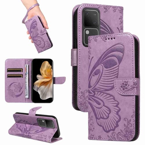 Para Vivo S18 5G Swallowtail Butterfly Funda de Cuero para Teléfono En Relieve (Púrpura)