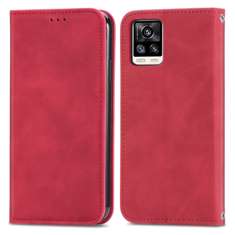 Para Vivo V20 2021 Retro Siente Siente Magnético Funda de Cuero Horizontal Flip con Titular y Slots de Tarjetas y Billetera y Marco de Fotos (Rojo)