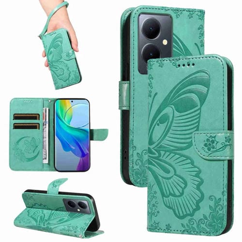 Para Vivo V29 Lite / Y78 5G / Y78 + 5G Funda para Teléfono de Cuero con Relieve de Mariposa de Cola de Golondrina (Verde)