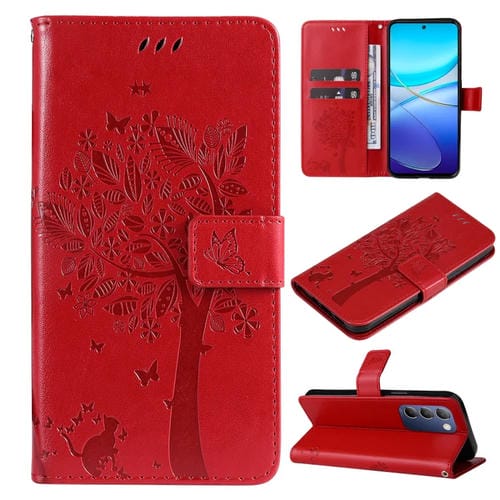 Para Vivo V40 Se 5G / Y100 Idn Funda para Teléfono de Cuero con Tapa con Patrón En Relieve de Árbol y Gato (Rojo)