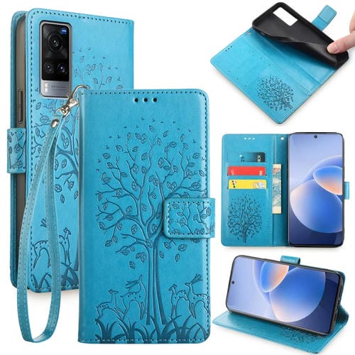 Para Vivo X60 Funda de Cuero con Relieve de Árbol y Ciervo (Azul)