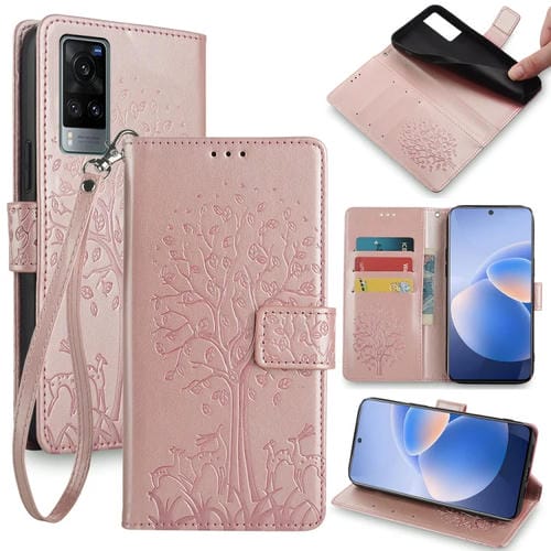 Para Vivo X60 Funda de Cuero con Relieve de Árbol y Ciervo (Oro Rosa)