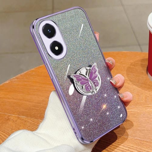 Para Vivo Y02S Funda para Teléfono de TPU con Soporte de Mariposa con Brillo Degradado Plateado (Púrpura)