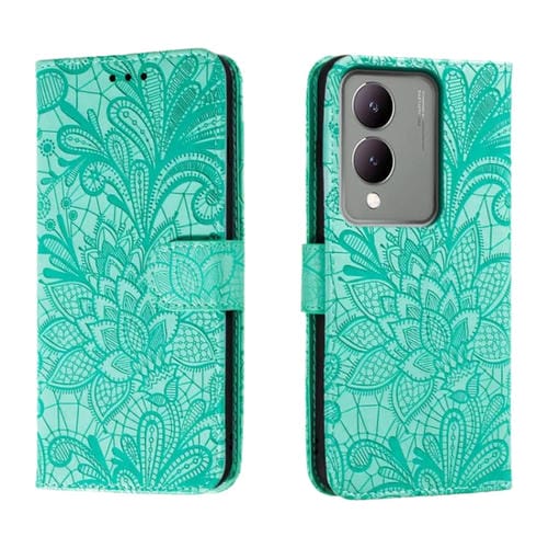 Para Vivo Y17S Funda para Teléfono de Cuero con Tapa y Estampado de Flores de Encaje (Verde)