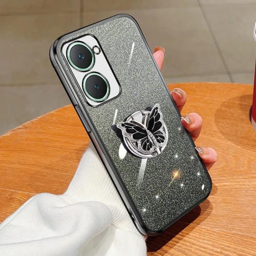 Para Vivo Y18 Funda para Teléfono de TPU con Soporte de Mariposa con Brillo Degradado Plateado (Negro)