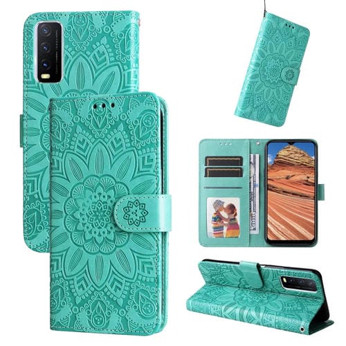 Para Vivo Y20 Estuche para Teléfono de Cuero con Estampado de Girasol En Relieve (Verde)