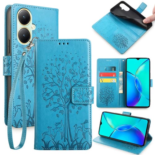 Para Vivo Y35M + 5G / Y35 + 5G Funda para Teléfono de Cuero con Relieve de Árbol y Ciervo (Azul)