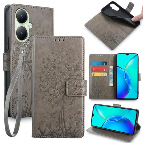 Para Vivo Y35M + 5G / Y35 + 5G Funda para Teléfono de Cuero con Relieve de Árbol y Ciervo (Gris)
