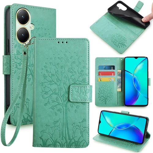 Para Vivo Y35M + 5G / Y35 + 5G Funda para Teléfono de Cuero con Relieve de Árbol y Ciervo (Verde)
