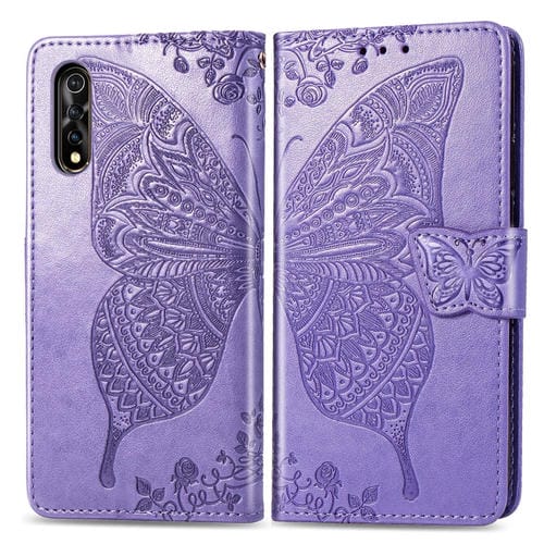 Para Vivo Y7S / S1 Butterfly Love Flowers Estuche de Cuero con Tapa Horizontal En Relieve con Soporte, Ranuras para Tarjetas, Billetera y Cordón (Morado Claro)