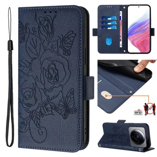 Para Xiaomi 12S Ultra Embossed Rose Rfid Funda de Cuero Antirrobo para Teléfono (Azul Oscuro)