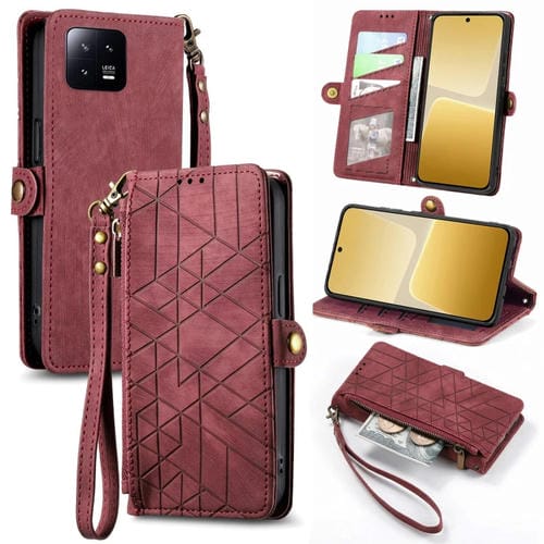 Para Xiaomi 13 Cartera con Cremallera Geométrica Caja de Teléfono de Cuero con Hebilla Lateral (Rojo)