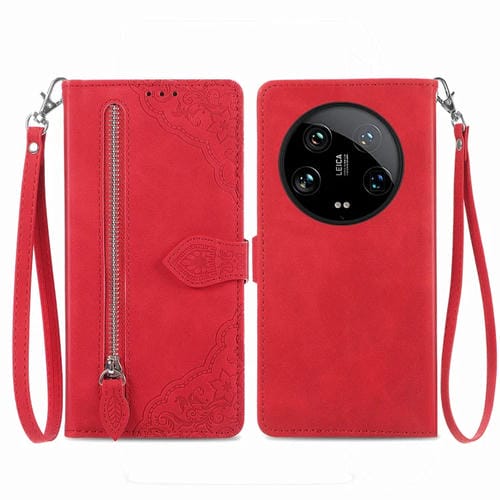 Para Xiaomi 14 Funda De Cuero Con Cremallera Y Flores En Relieve Ultra (Rojo)