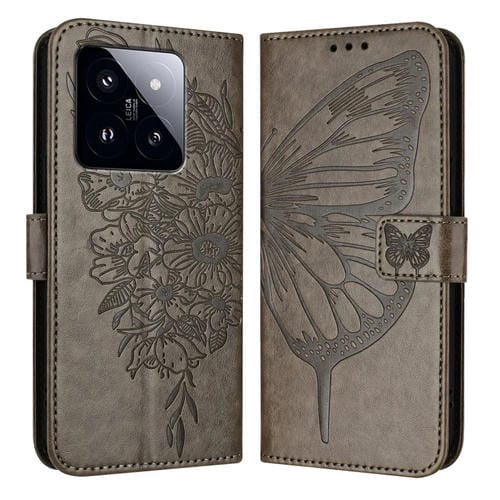 Para Xiaomi 14 Pro 5G Funda De Teléfono De Cuero Con Mariposa En Relieve Global (Gris)