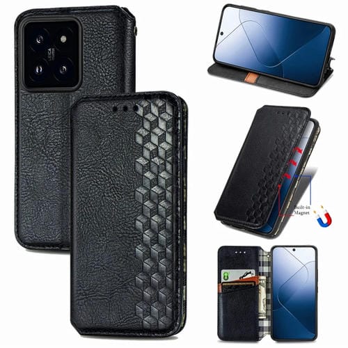 Para Xiaomi 14 Pro Cubic Grid Funda De Teléfono De Cuero Magnético Prensado (Negro)