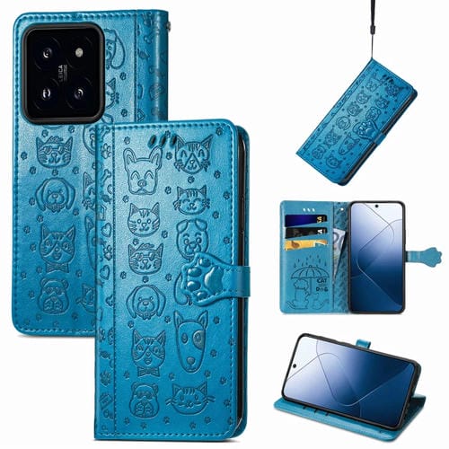 Para Xiaomi 14 Pro Funda De Teléfono De Cuero Con Relieve De Perro Y Gato (Azul)