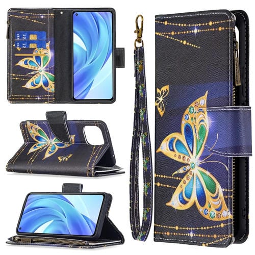 Para Xiaomi Mi 11 Lite Patrón de Dibujo de Color Cremallera con Cremallera de Cuero Horizontal con Soporte y Tragamonedas y Billetera (Mariposa Grande)