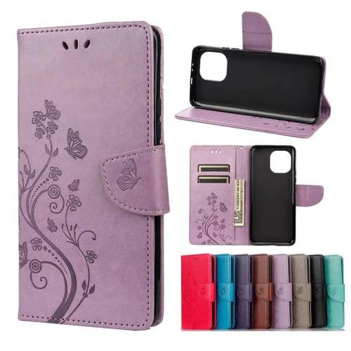 Para Xiaomi Mi 11 Modelo de Flores de Mariposa Flip Horizontal Funda de Cuero con Soporte y Ranuras para Tarjeta y Billetera (Púrpura Claro)