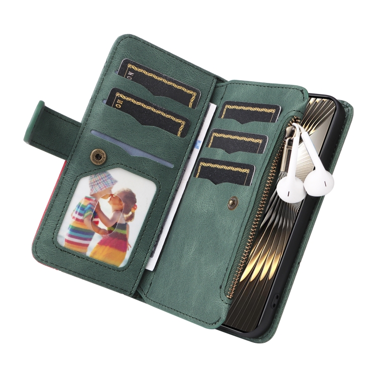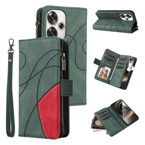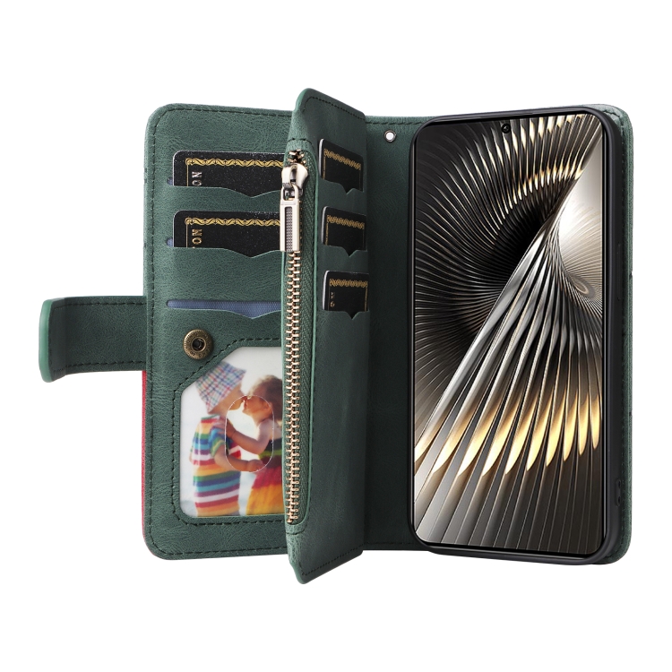 Para Xiaomi Poco F6 Funda de Cuero para Teléfono con Billetera con Cremallera y 9 Ranuras para Tarjetas de Doble Color (Verde)