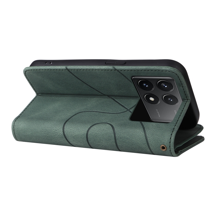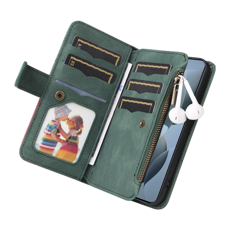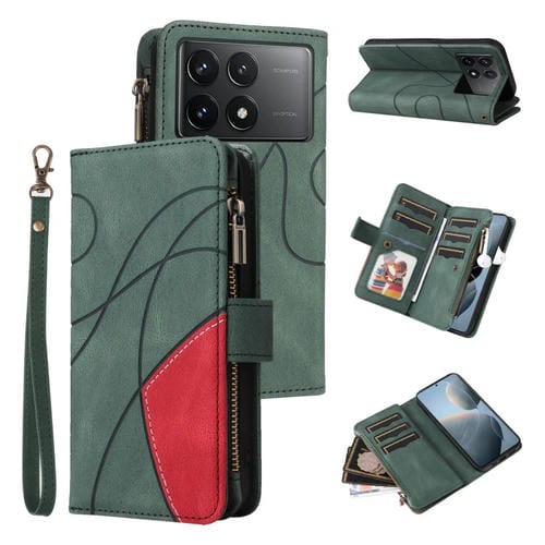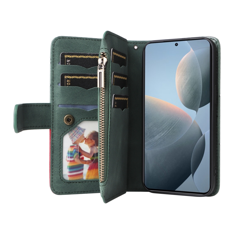 Para Xiaomi Poco F6 Pro Funda de Cuero para Teléfono con Billetera con Cremallera y 9 Ranuras para Tarjetas de Doble Color (Verde)
