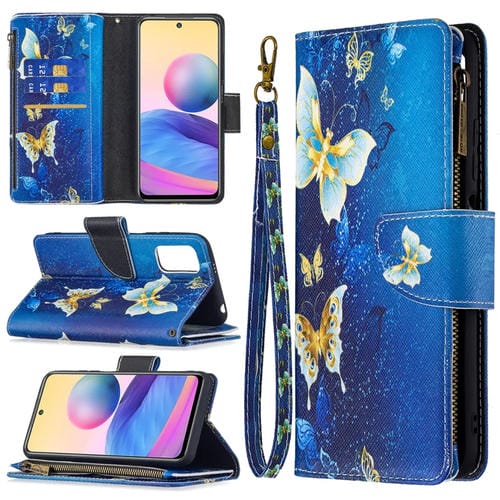 Para Xiaomi Poco M3 Pro / Redmi Note 10 5G Coloreado de Dibujo de Dibujo con Cremallera Funda de Cuero con Soporte y Ranuras para Tarjetas y Billetera (Mariposa de Oro)