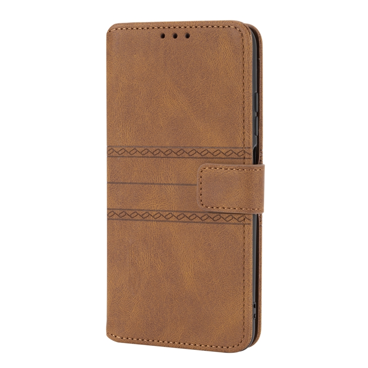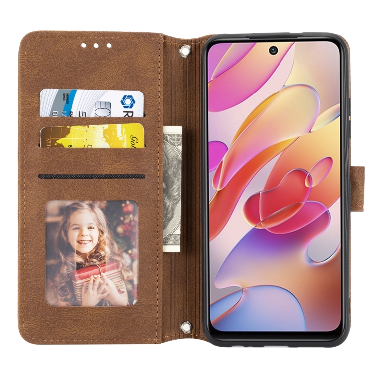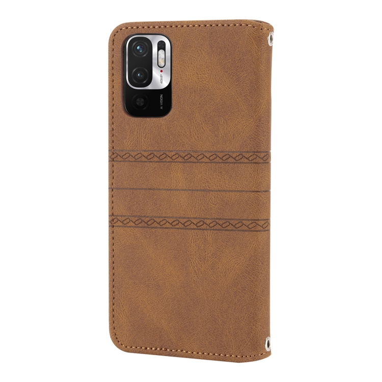 Para Xiaomi Redmi Note 10 5G Hebilla Magnética de Rayas En Relieve Pu + TPU Funda de Cuero de Flip Horizontal con Soporte y Ranura para Tarjeta y Billetera y Marco de Fotos y Sling (Marrón)