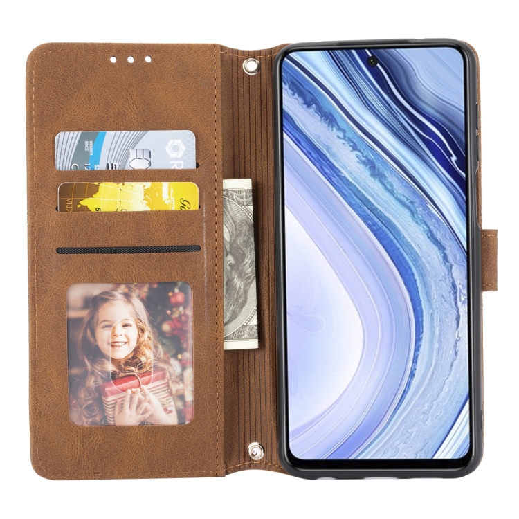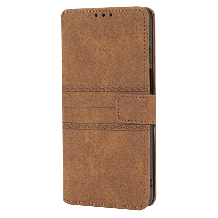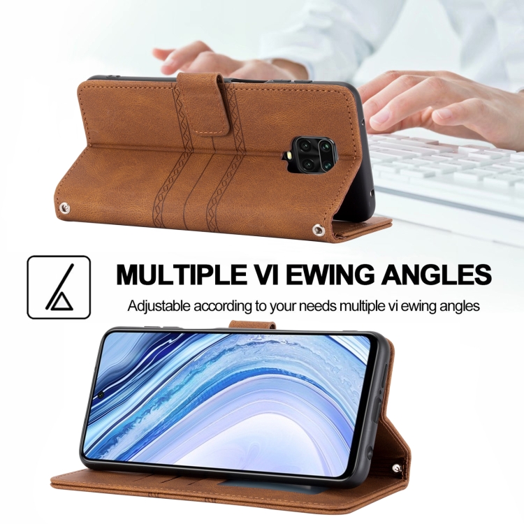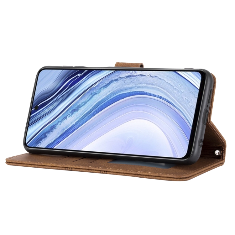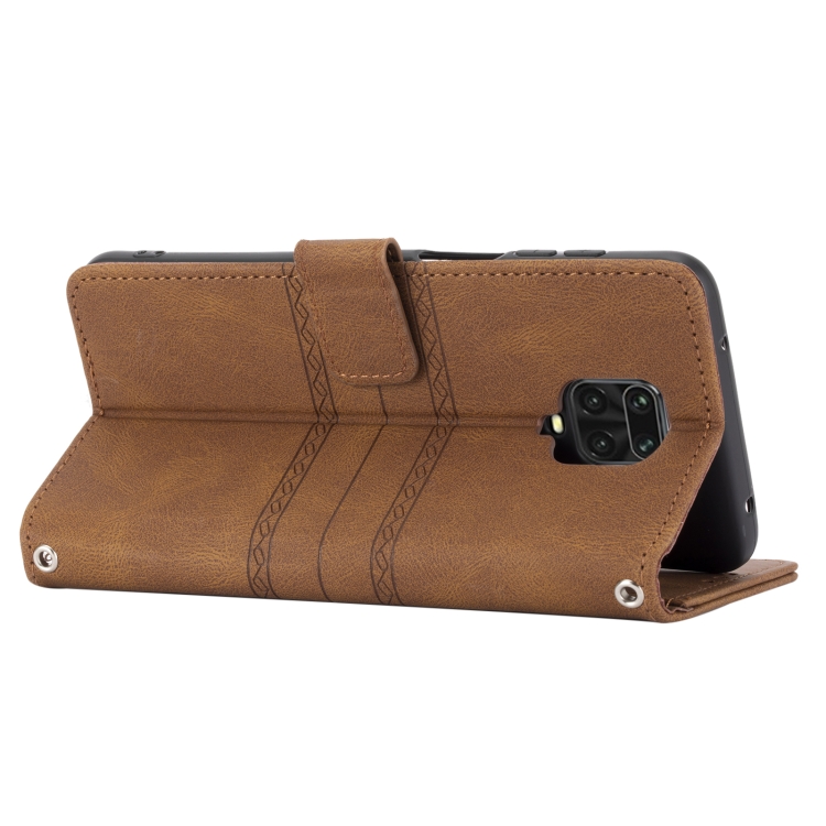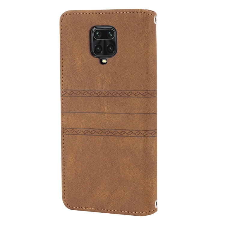 Para Xiaomi Redmi Note 9 Pro Max Hebilla Magnética de Rayas En Relieve Pu + TPU Funda de Cuero de Flip Horizontal con Soporte y Ranura para Tarjeta y Billetera y Marco de Fotos y Sling (Marrón)