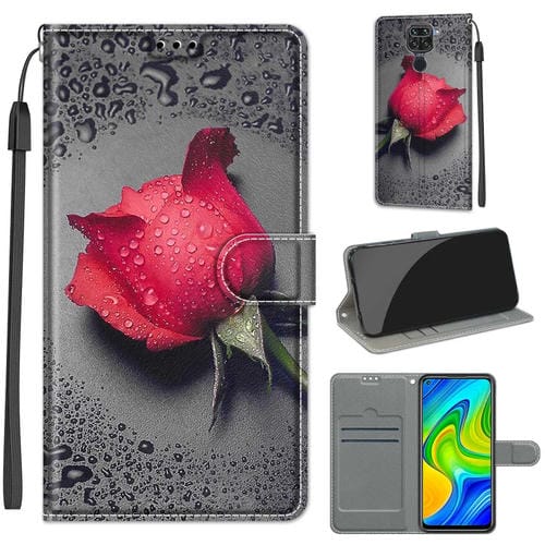 Para Xiaomi Redmi Note 9 / Redmi 10X 4G Dibujo de Color de Voltaje Cierre Magnético Horizontal Flip Pu Funda de Cuero con Soporte y Ranuras para Tarjetas (C14 Black Water Drop Rose)