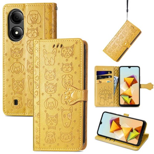 Funda para ZTE Blade A33S de Cuero con Relieve de Perro y Gato (Amarillo)