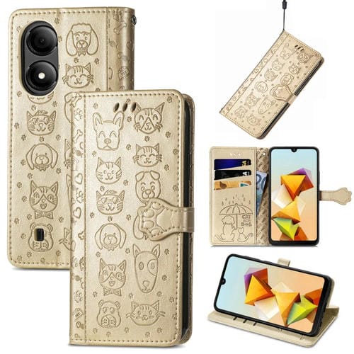 Funda para ZTE Blade A33S de Cuero con Relieve Perro y Gato (Dorado)