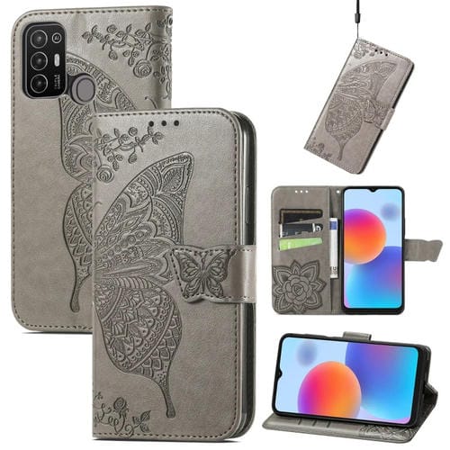 Estuche para ZTE Blade A52 Butterfly Love Flower de Cuero en Relieve (Gris)