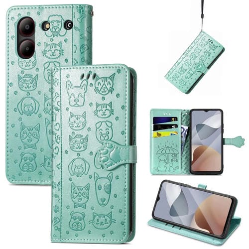 Funda para ZTE Blade A54 de Cuero con Relieve de Perro y Gato (Verde)