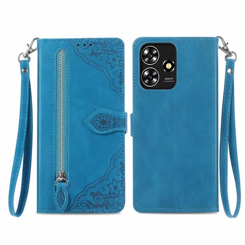 Funda de Cuero con Cremallera y Flores para ZTE Blade A73 4G (Azul)