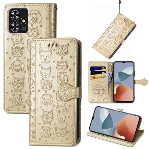Funda de Cuero con Relieve para ZTE Blade A73 4G para Perros y Gatos (Dorado)
