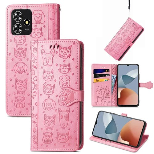 Funda de Cuero para ZTE Blade A73 4G con Relieve Perros y Gatos (Rosa)