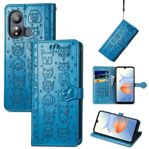 Funda para teléfono ZTE Blade L220 Cuero con Relieve de Gato y Perro (Azul)