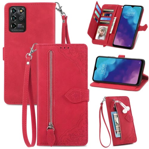 Estuche para ZTE Blade V30 Vita de Cuero con Cremallera y Flor en Relieve (Rojo)