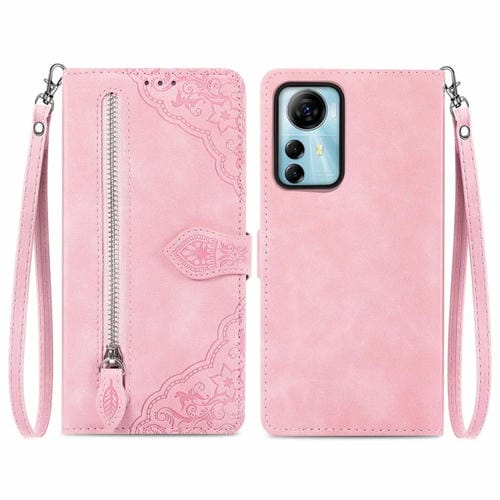 Funda de Cuero para ZTE Blade V41 con Cremallera y Flor en Relieve Inteligente (Rosa)