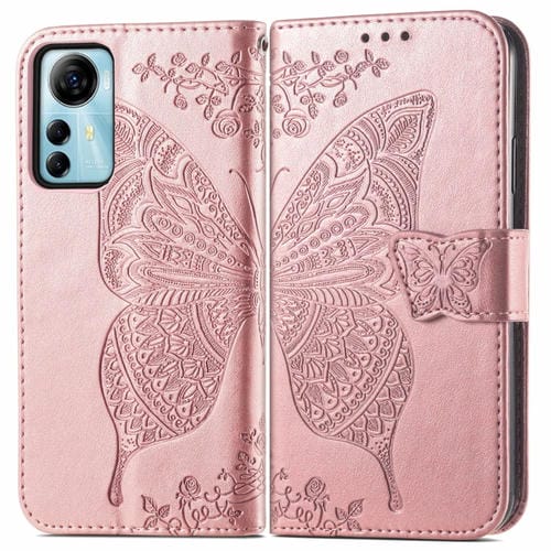 Funda de Cuero para ZTE Blade V41 Smart con Diseño Butterfly Love Flower en Relieve (Oro Rosa)