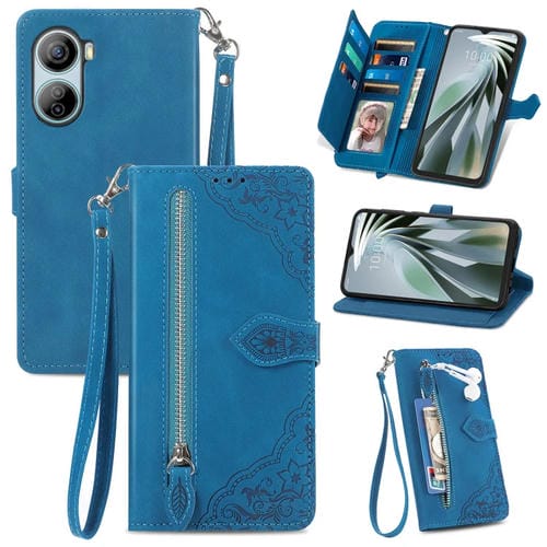 Funda de Cuero para ZTE Libero 5G Iv con Cremallera y Flor en Relieve (Azul)