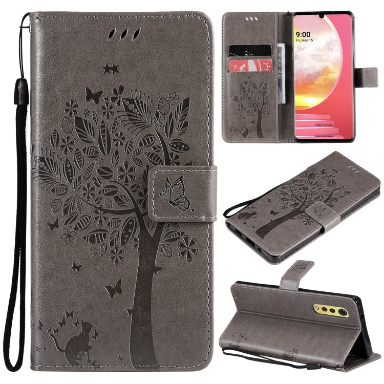 Funda de Cuero PU con Soporte, Tarjetero y Cordón para LG Velvet 2 Pro (Gray) con Patrón Árbol y Gato