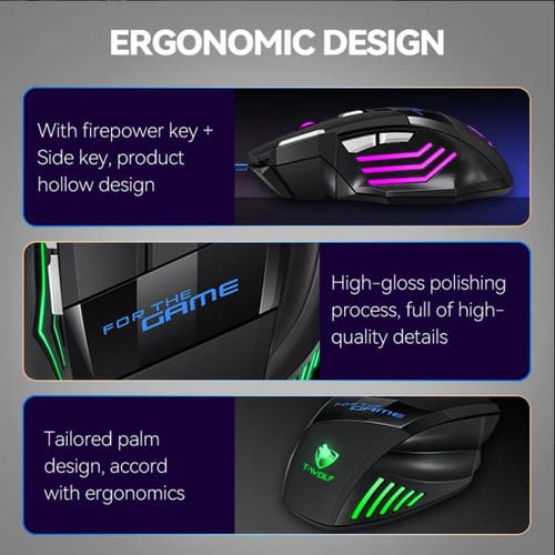 • 1x Ratón para Juegos T-Wolf M1 con Cable USB y Luz Ambiental RGB de 7 Teclas (Negro)