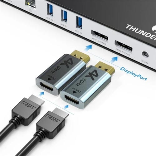 - Transferencia Thunderbolt 3 hasta 40 Gbps, Carga de host PD de 60 W, Soporte para Pantallas duales 4K a 60 Hz o un solo monitor 8K/5K, Gigabit Ethernet, entrada/salida de audio, 1 USB-C (10 Gbps), 2 USB-A (10 Gbps), 2 USB-A (5 Gbps), incluye dos adaptadores Active DisplayPort a HD 2.0 y tres Cables (incluidos)