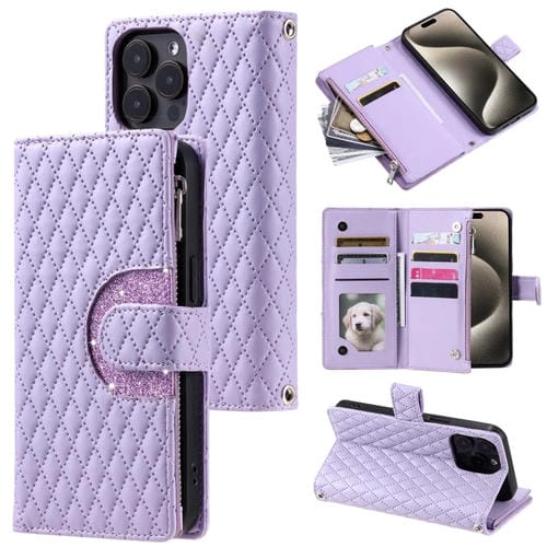 Funda de Cuero para iPhone 16 Pro Max con Cremallera y Textura de Cuadrícula con Cordón (Morado)