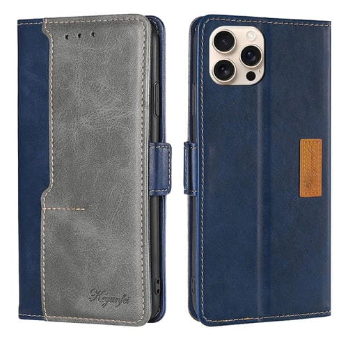 Funda de Cuero para iPhone 16 Pro Max con Hebilla Lateral y Color en Contraste (Azul y Gris)