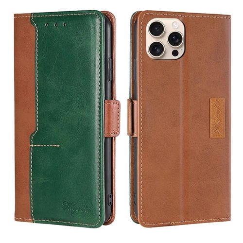 Funda de Cuero para iPhone 16 Pro Max con Hebilla Lateral y Color En Contraste (Marrón Claro y Verde)