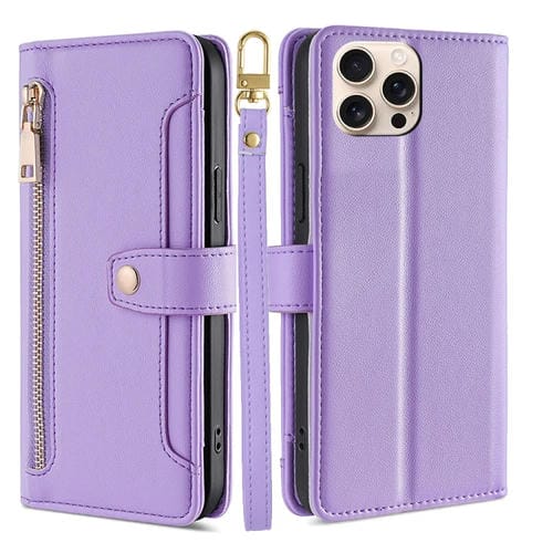 Funda Tipo Billetera de Cuero con Cremallera y Textura de Oveja para iPhone 16 Pro Max (Morado)