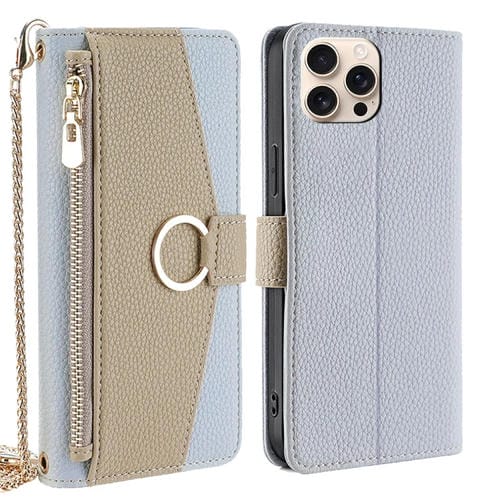 Funda Tipo Billetera Cuero con Cremallera Diseño Cruzado Textura Oveja para iPhone 16 Pro Max (Azul)