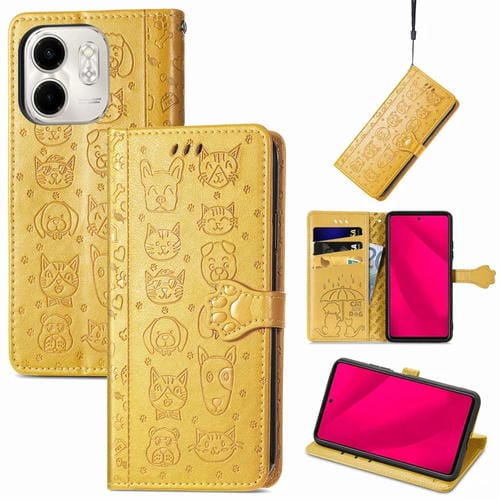 Funda de Piel con Relieve de Gato y Perro para Infinix Smart 9 (Amarilla)